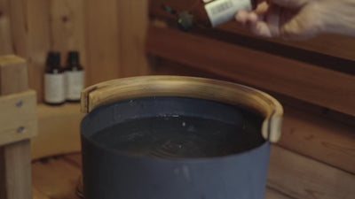 - Prepare your water. Fill your sauna bucket with hot water. Add about five drops of your chosen Löy aroma and stir gently. You can adjust the amount to your preference, starting light, and then add more as needed.